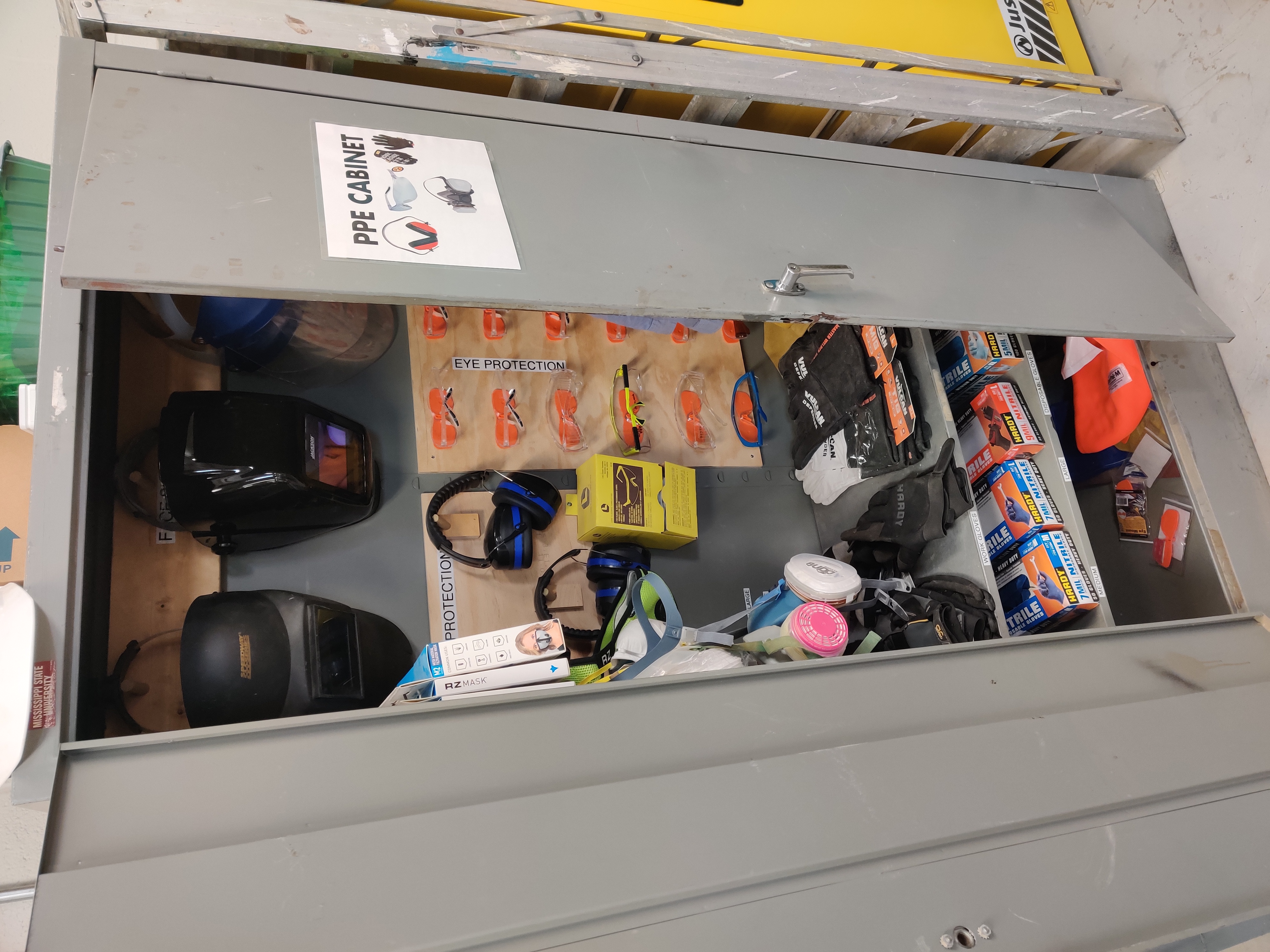 All necessary personal protective equipment is located in the gray cabinet next to the main entrance.