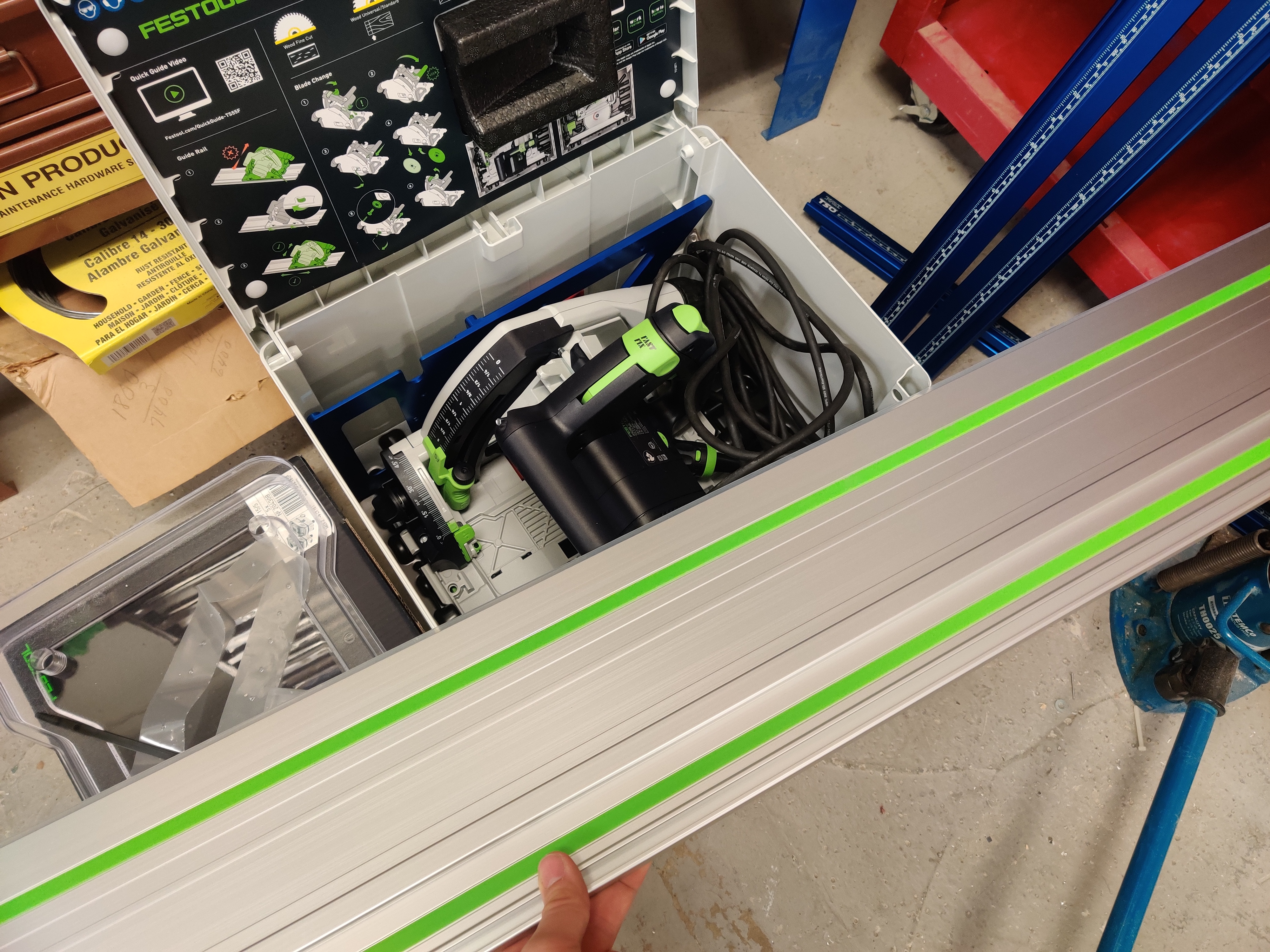 The tracks allow this special saw to make accurate, straight cuts, and is best used for dividing sheets of plywood for the table saw.